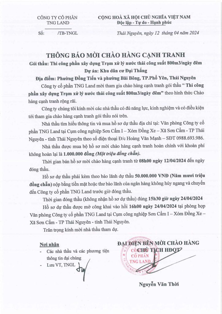 TNG Land Joint Stock Company invites participation in competitive bidding for the ” Construction of a wastewater treatment plant with a capacity of 800 m3/day” package through a widely competitive bidding process.