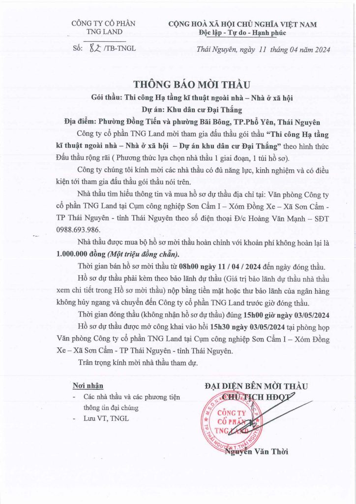 Hồ sơ dự thầu được mở công khai vào hồi 15h30 ngày 03/05/2024 tại phòng họp Văn phòng Công ty cổ phần TNG Land tại Cụm công nghiệp Sơn Cẩm I – Xóm Đồng Xe – Xã Sơn Cẩm – TP Thái Nguyên – tỉnh Thái Nguyên.