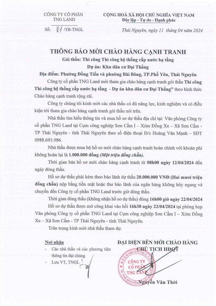 Hồ sơ dự thầu được mở công khai vào hồi 16h30 ngày 22/04/2024 tại phòng họp Văn phòng Công ty cổ phần TNG Land tại Cụm công nghiệp Sơn Cẩm I – Xóm Đồng Xe – Xã Sơn Cẩm – TP Thái Nguyên – tỉnh Thái Nguyên.