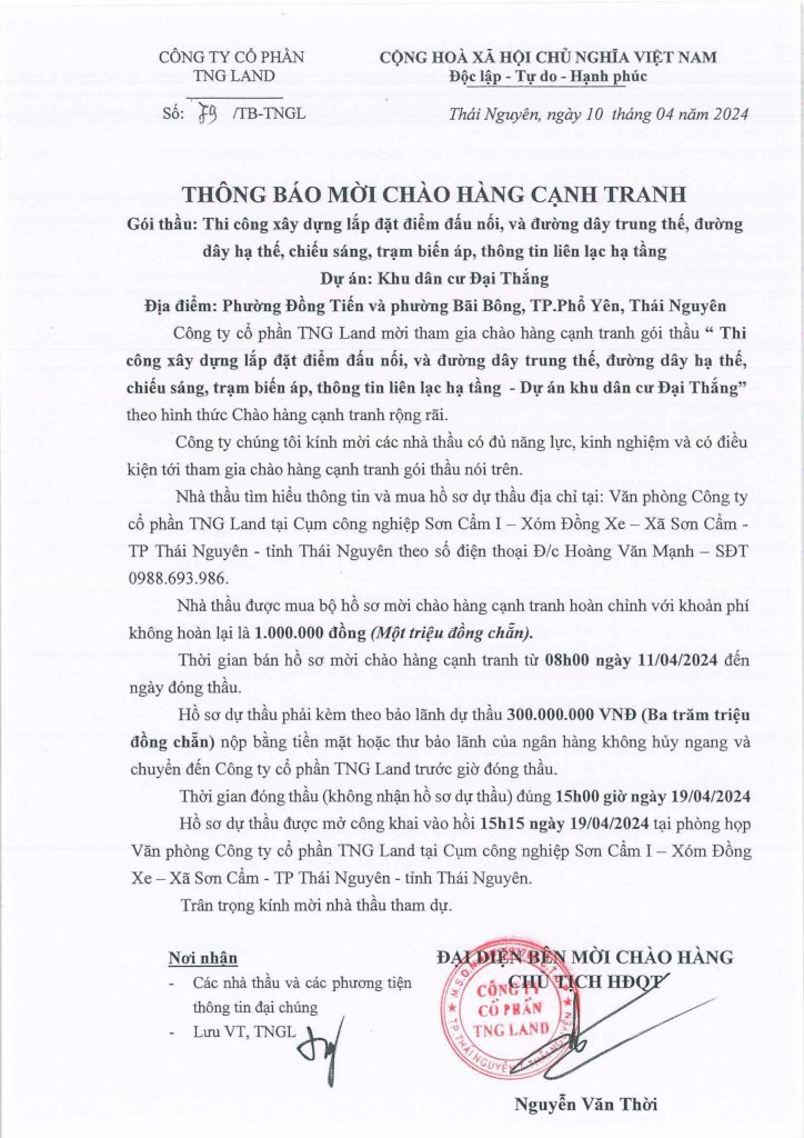 Công ty cổ phần TNG Land mời tham gia chào hàng cạnh tranh gói thầu “ Thi công xây dựng lắp đặt điểm đấu nối, và đường dây trung thế, đường dây hạ thế, chiếu sáng, trạm biến áp, thông tin liên lạc hạ tầng – Dự án khu dân cư Đại Thắng” theo hình thức Chào hàng cạnh tranh rộng rãi.