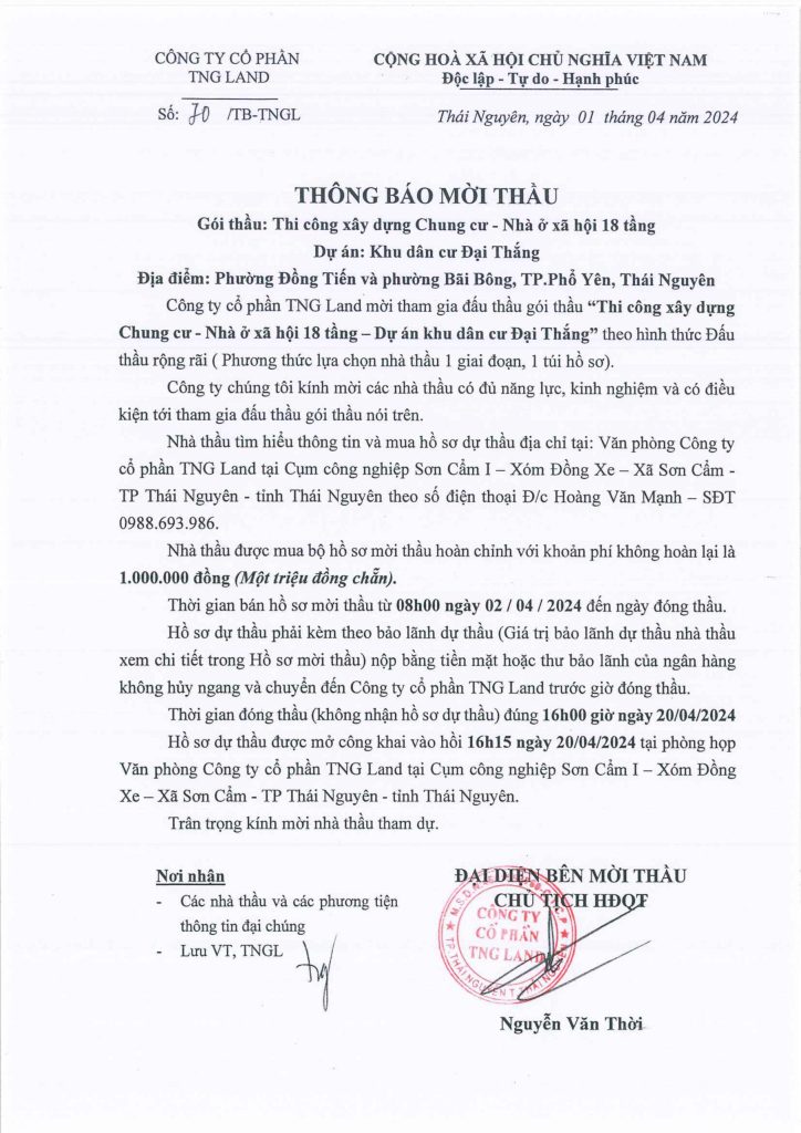 Hồ sơ dự thầu được mở công khai vào hồi 16h15 ngày 20/04/2024 tại phòng họp Văn phòng Công ty cổ phần TNG Land tại Cụm công nghiệp Sơn Cẩm I – Xóm Đồng Xe – Xã Sơn Cẩm – TP Thái Nguyên – tỉnh Thái Nguyên.